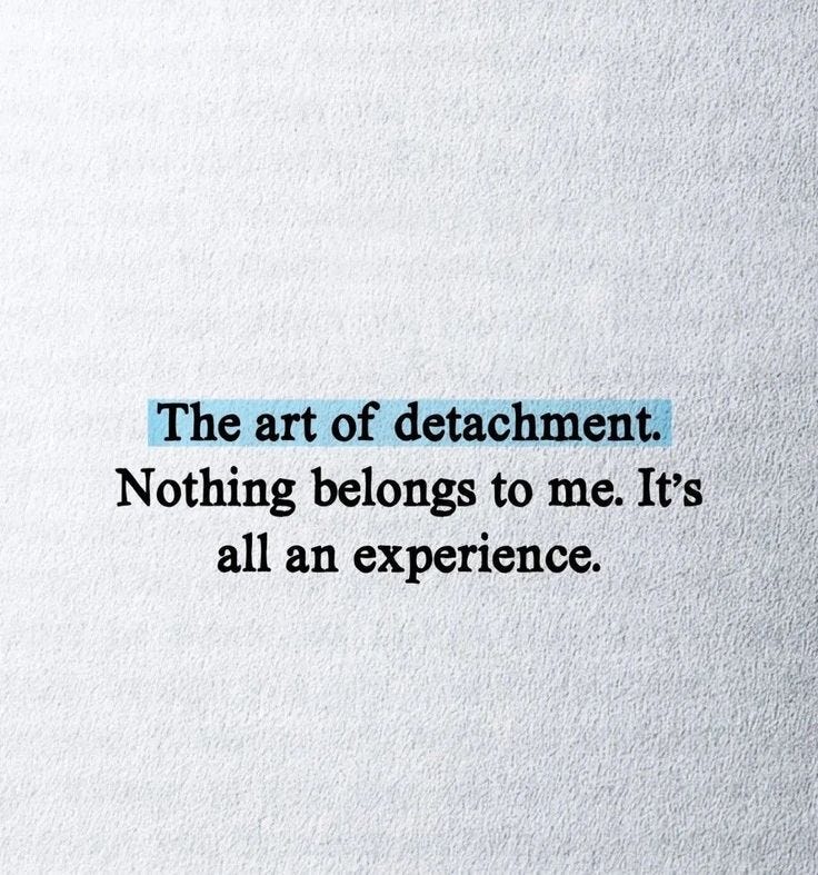 Detachment is the deliberate release of emotional attachment to outcomes, future expectations, beliefs, and the need to control—while remaining fully present and responsible for one’s actions. i.e, you stop gripping what you can’t control.